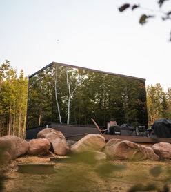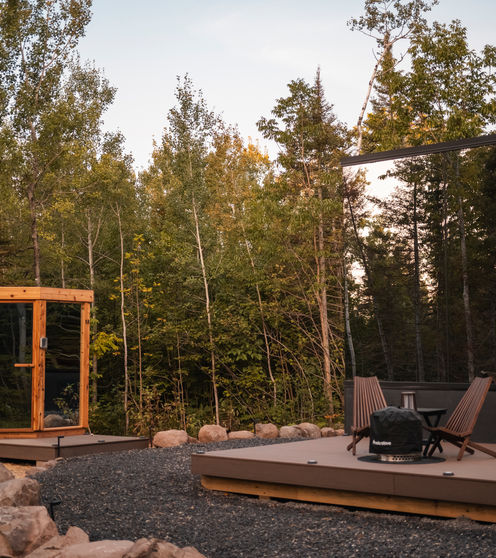 A private mirror cabin tucked into the North Shore woods. 360° glass walls, outdoor sauna, and your own fire pit under the stars.
